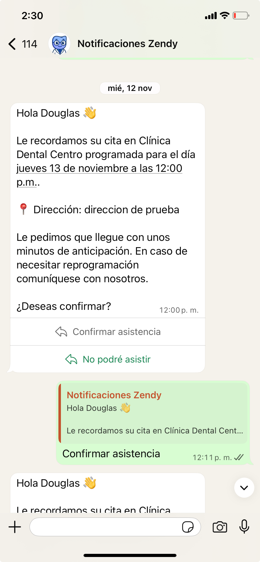 Por ejemplo: si hoy creas una cita para mañana a las 2:00 pm, mañana a las 2:00 pm Zendy enviará un mensaje automático al paciente recordándole su cita.