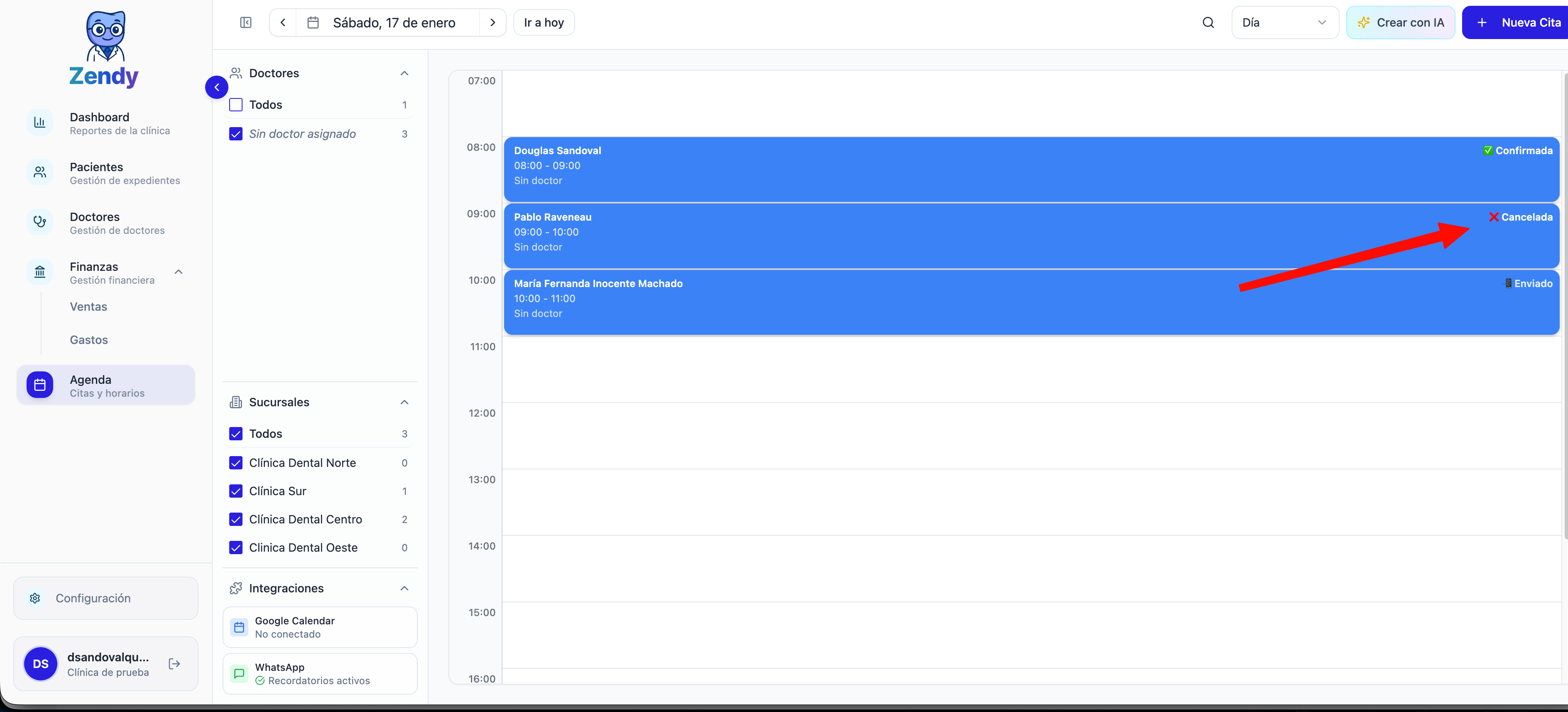 Cuando un paciente confirma o cancela vía WhatsApp, esa información aparece directamente en la agenda: